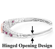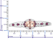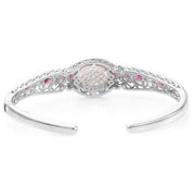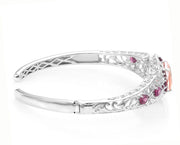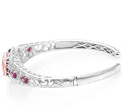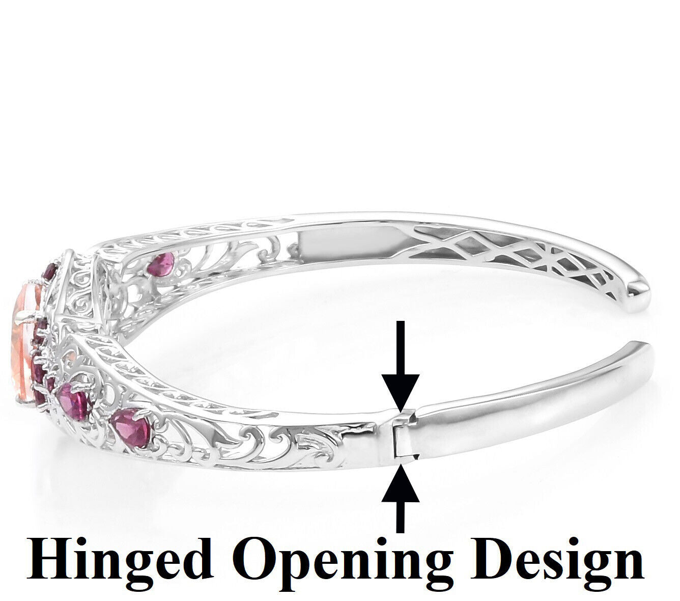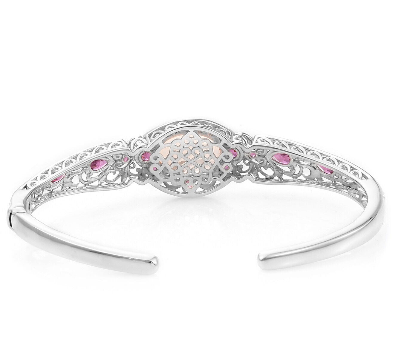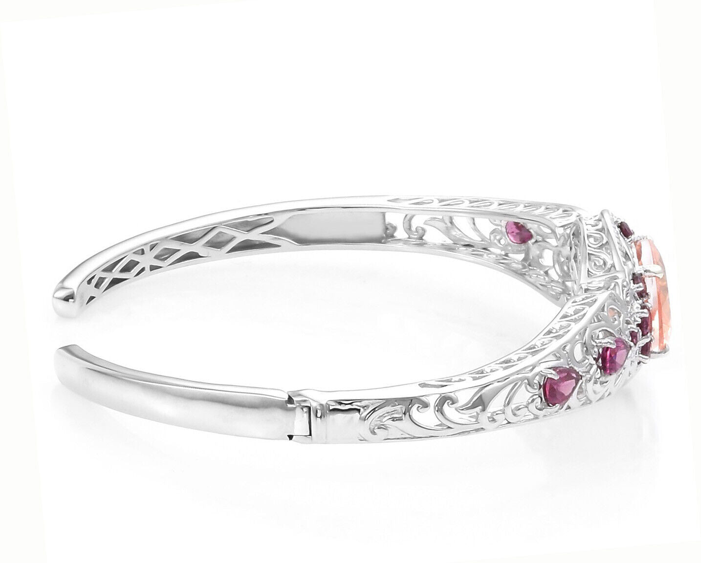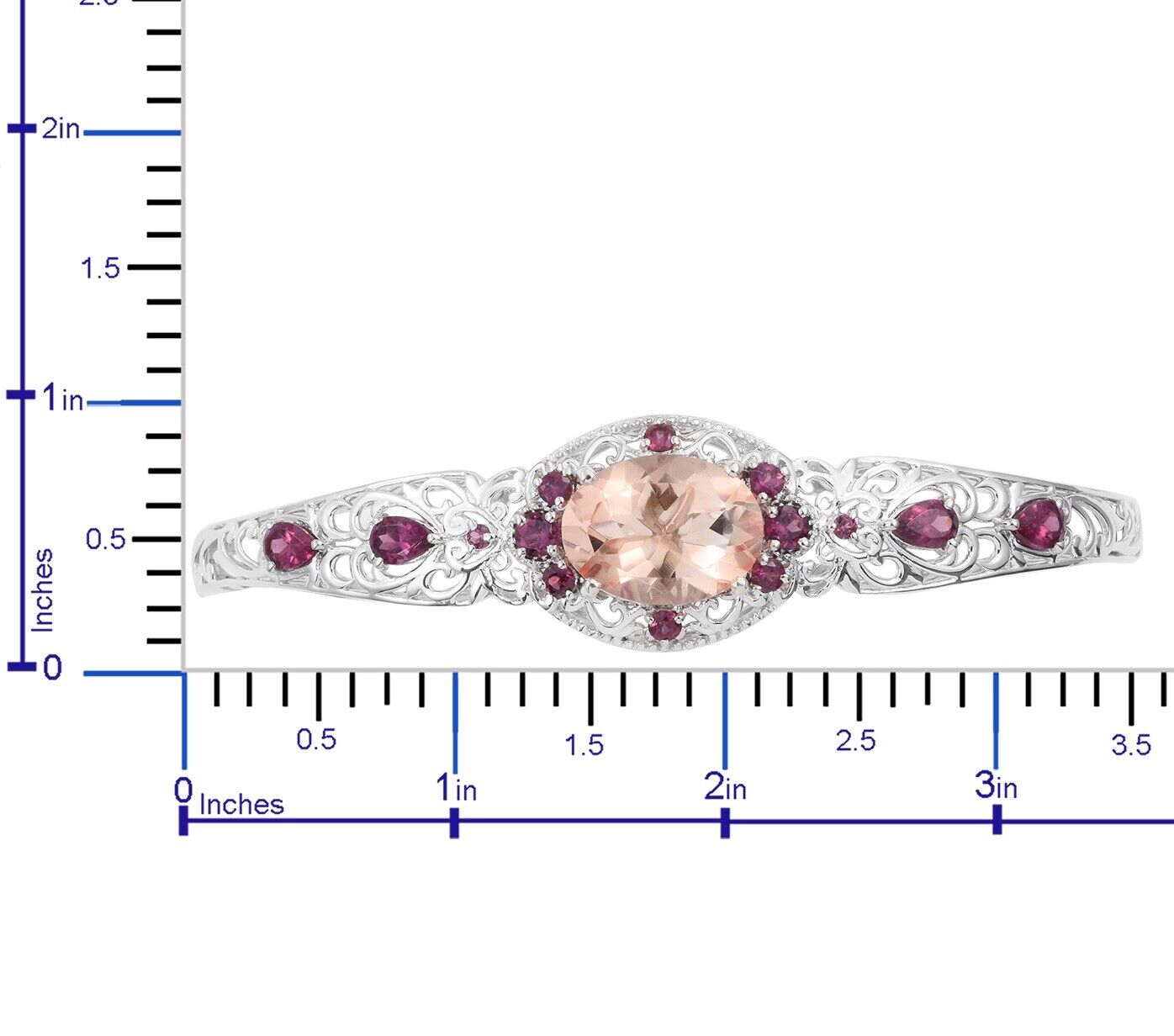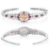 DESCRIPTION: Attain an enduring look with this enthralling Morganique quartz cuff. This bracelet has a unique opening design that enables it to accomodate sizes 7-1/2" to 8-1/2" inches. Morganique Quartz perfectly captures the soft pink to orange-pink of the gemstone Morganite. Ranking seven on the Mohs scale of hardness, makes this gem a great choice for daily wear. Exquisitely crafted in 925 sterling silver, the jewel is beautifully encrusted with brilliantly faceted oval of Moragnique quartz in center. The embellishments of Orissa Rhodolite Garnets enhances the beauty of the bracelet. With rampant tendril filigree all over and exceptional metal work, the cuff will steal the spotlight for you.