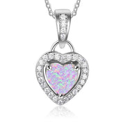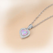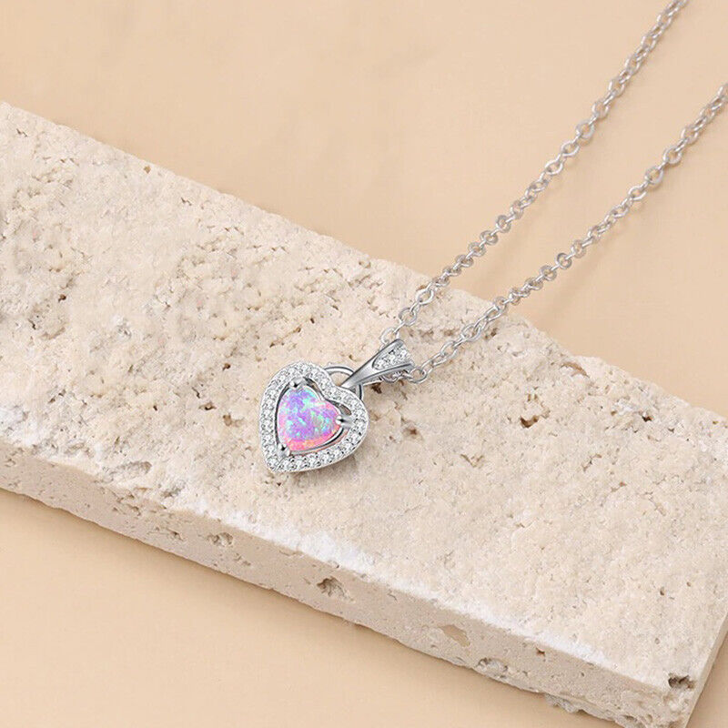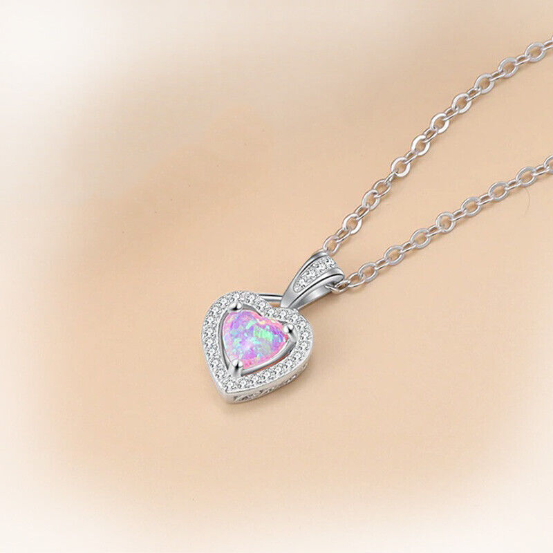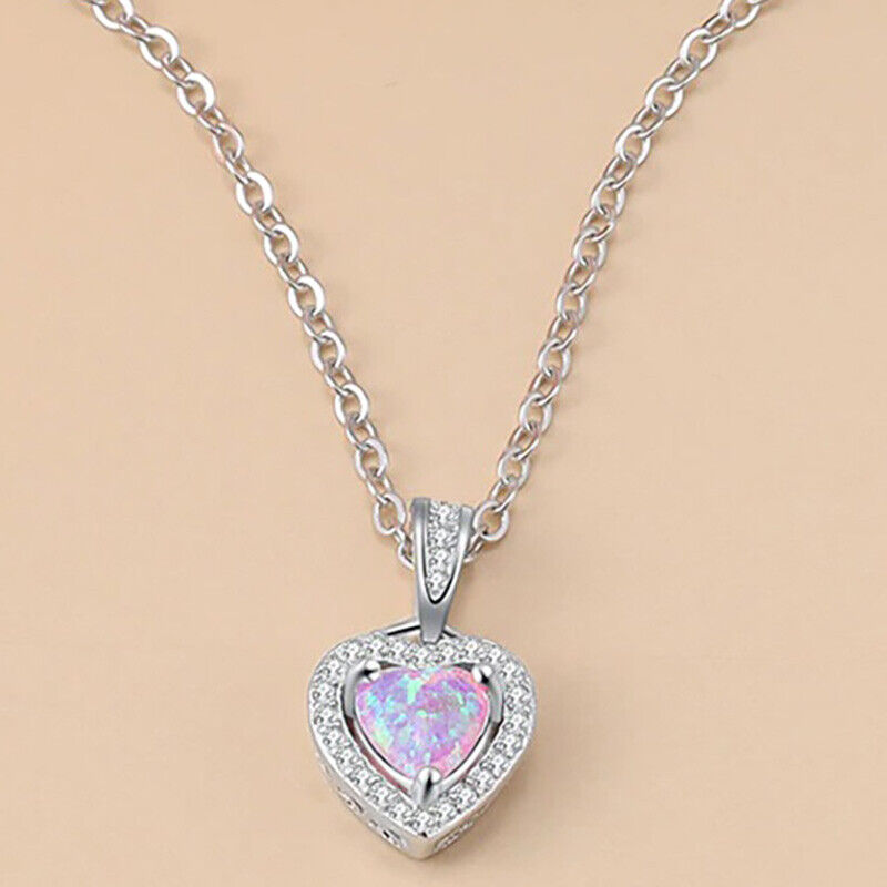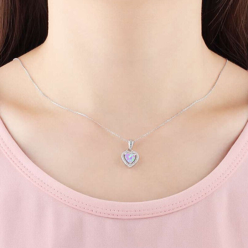 925 Sterling Silver Womens Pink Fire Opal Chain Link Heart Pendant Necklace D681