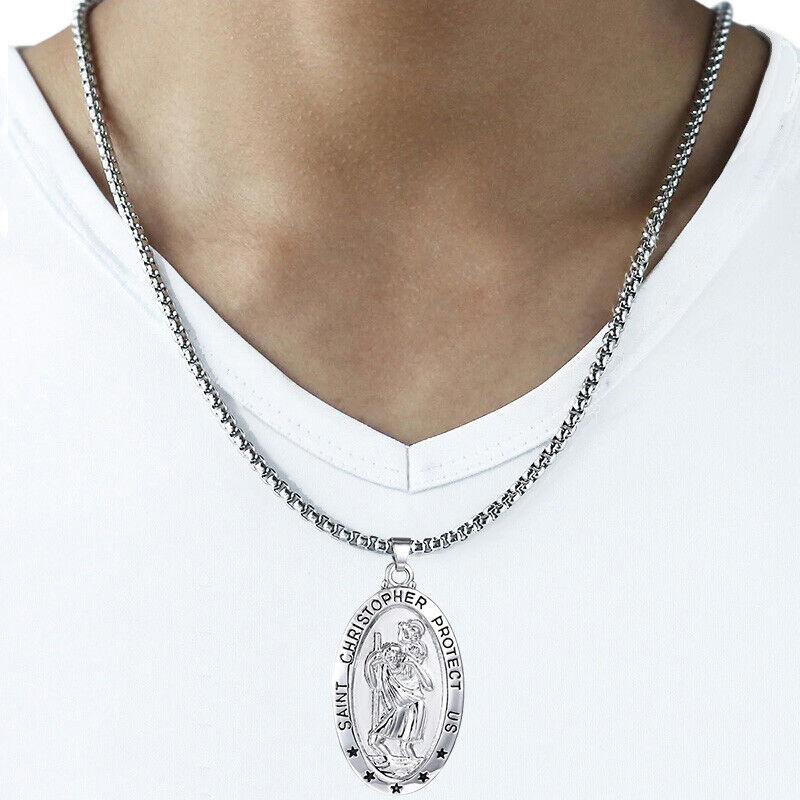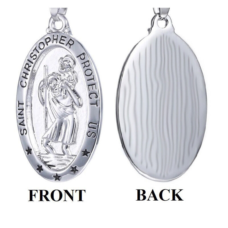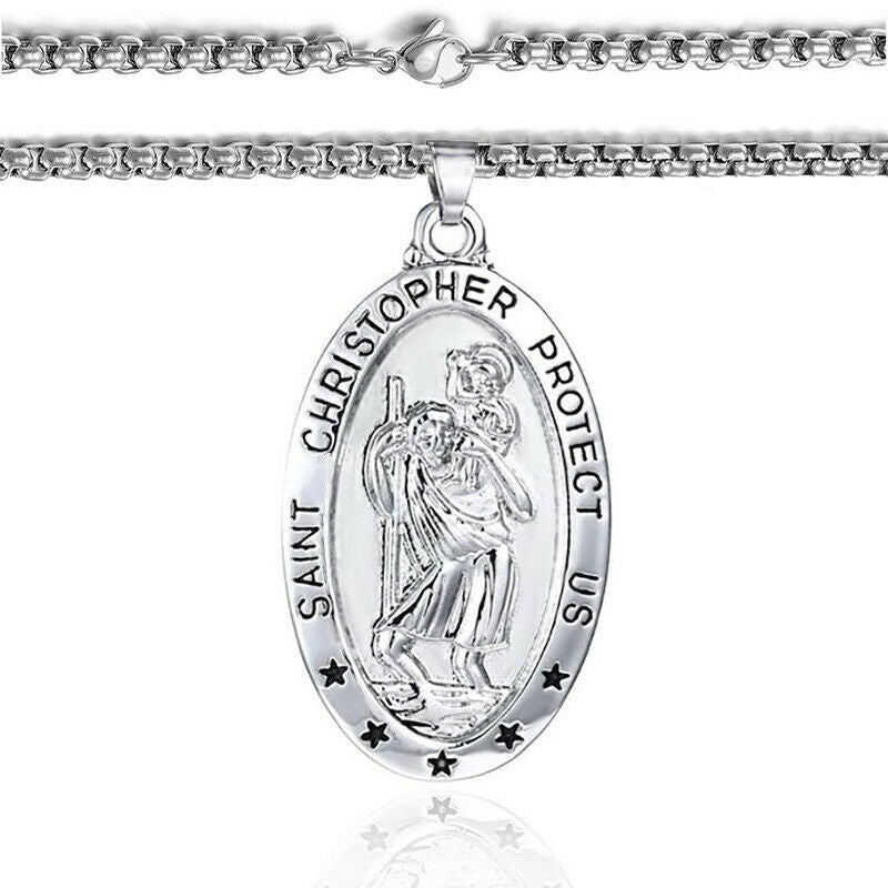 Mens 20" 24" 30" Silver Link Chain Necklace With St Saint Christopher Pendant